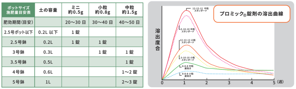 プロミック錠剤 投稿日 2022年6月7日 更新日 2025年12月18日 著者 平井香 カテゴリー 資材 錠剤イメージ 成分 N-K-P-Mg-CaO(%)=8-8-8-1-12 特徴 夏の多灌水でも安定して溶けるよう設計 肥効期間は、ミニ(約0.5g)は20~30日、小粒(約0.8g)は30~40日、中粒(約1.5g)は40~50日 1株に1錠と同量の施肥により、均一な健苗つくりに 施用 ポットに1錠、簡単に施用して肥料補給をします。 商品の入荷について 入荷までお時間をいただく場合がございます。あらかじめご承知おきください。